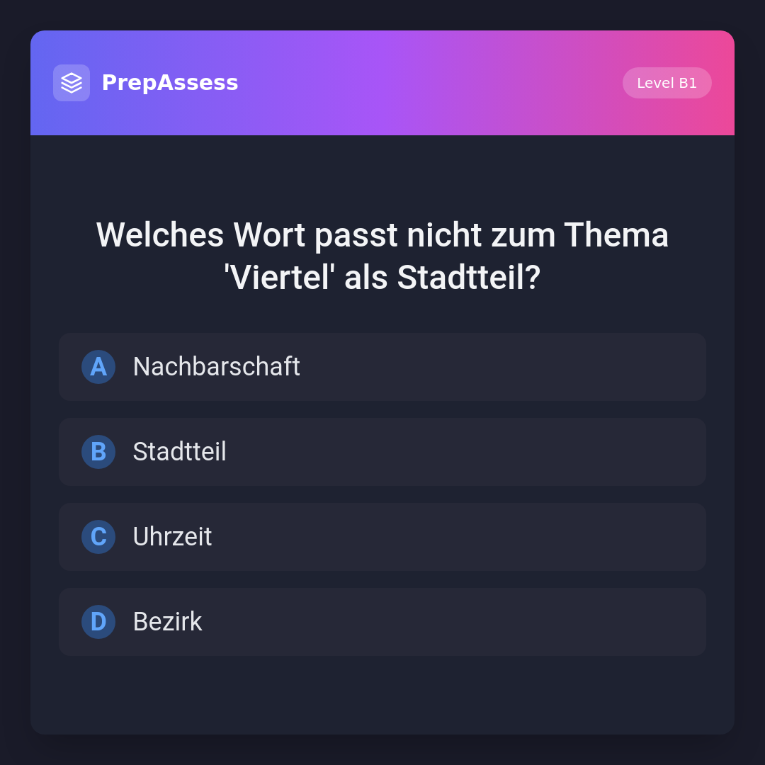 Welches Wort passt nicht zum Thema 'Viertel' als Stadtteil?