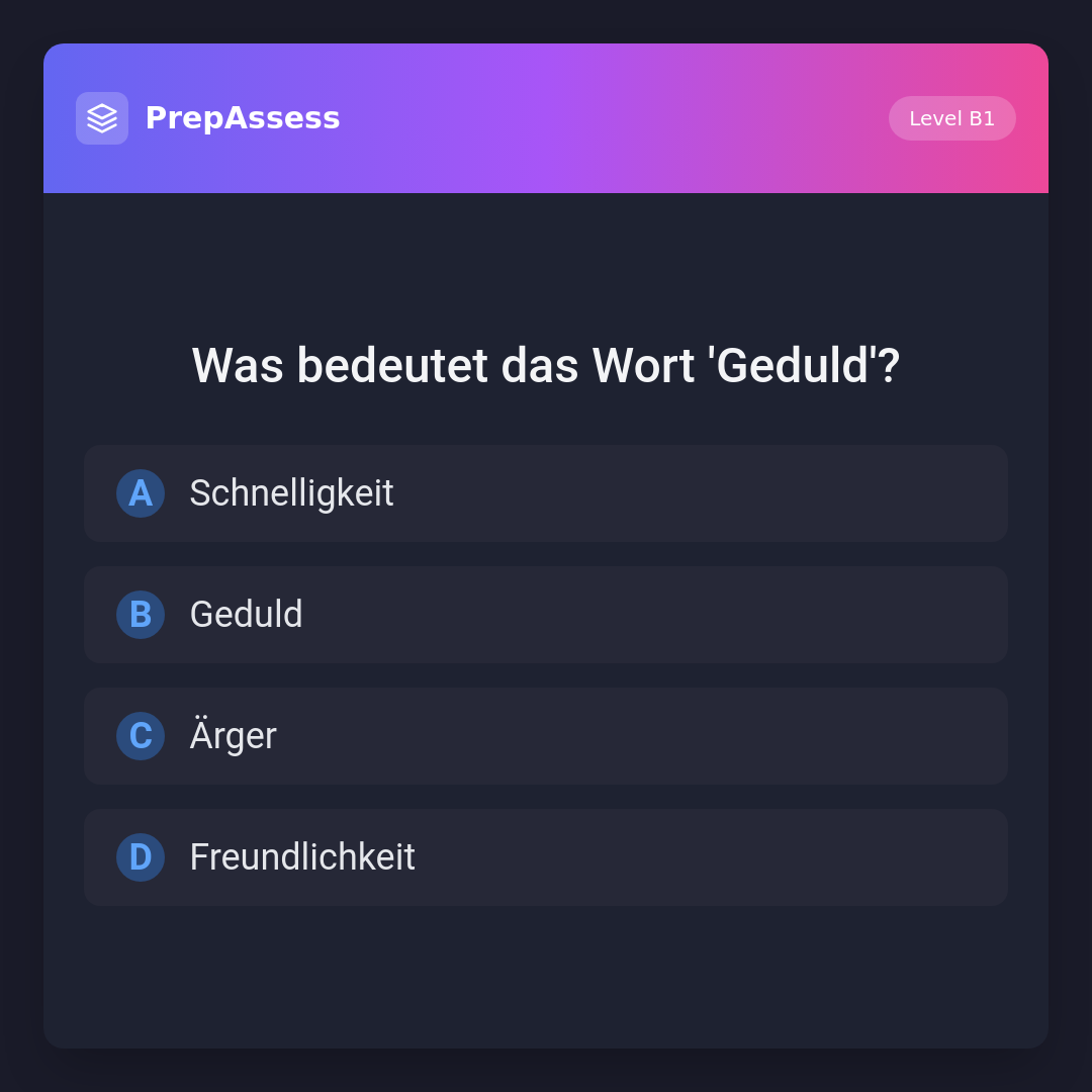 Das Wort 'Geduld' bedeutet die Fähigkeit, ruhig und gelassen zu bleiben, während man auf etwas wartet oder Schwierigkeiten begegnet. 'Schnelligkeit' bedeutet 'Geschwindigkeit', 'Ärger' bedeutet 'Wut' oder 'Unzufriedenheit' und 'Freundlichkeit' bedeutet 'Nettigkeit'.