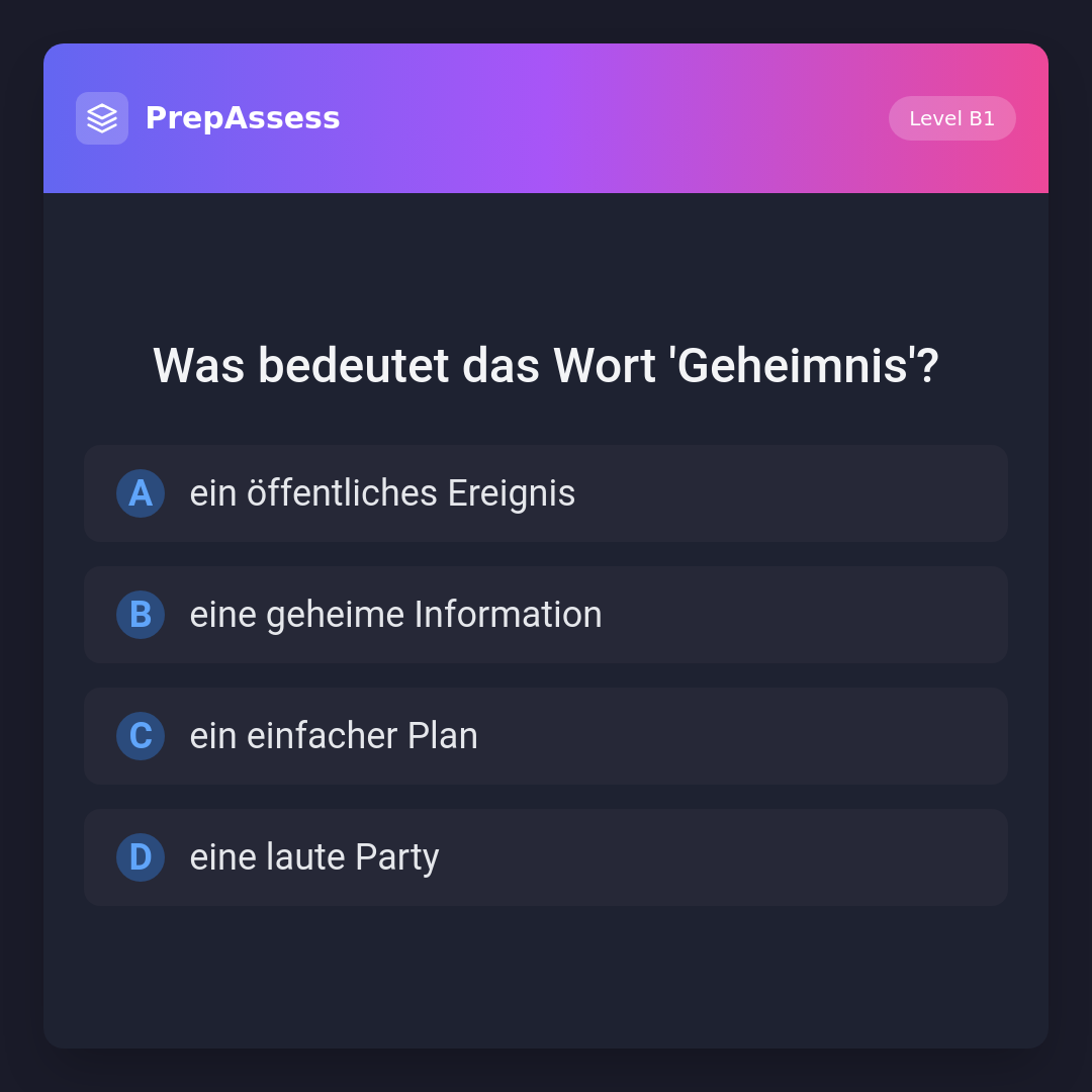 Das Wort 'Geheimnis' bedeutet 'eine geheime Information'. Die anderen Optionen beziehen sich nicht auf etwas, das verborgen oder geheim gehalten wird.