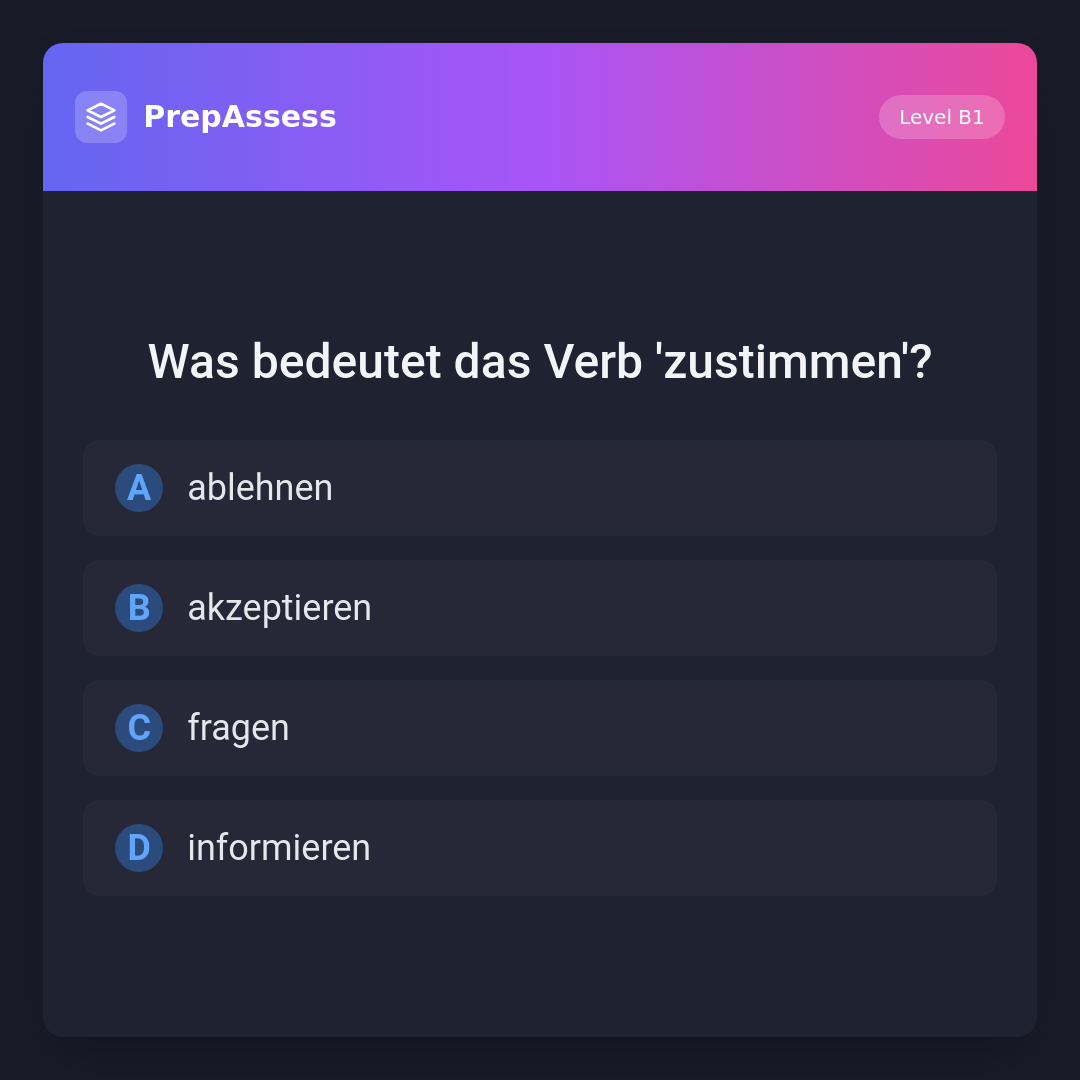 'Zustimmen' bedeutet, dass man mit etwas einverstanden ist oder etwas akzeptiert. 'Ablehnen' ist das Gegenteil, 'fragen' und 'informieren' sind andere Handlungen.