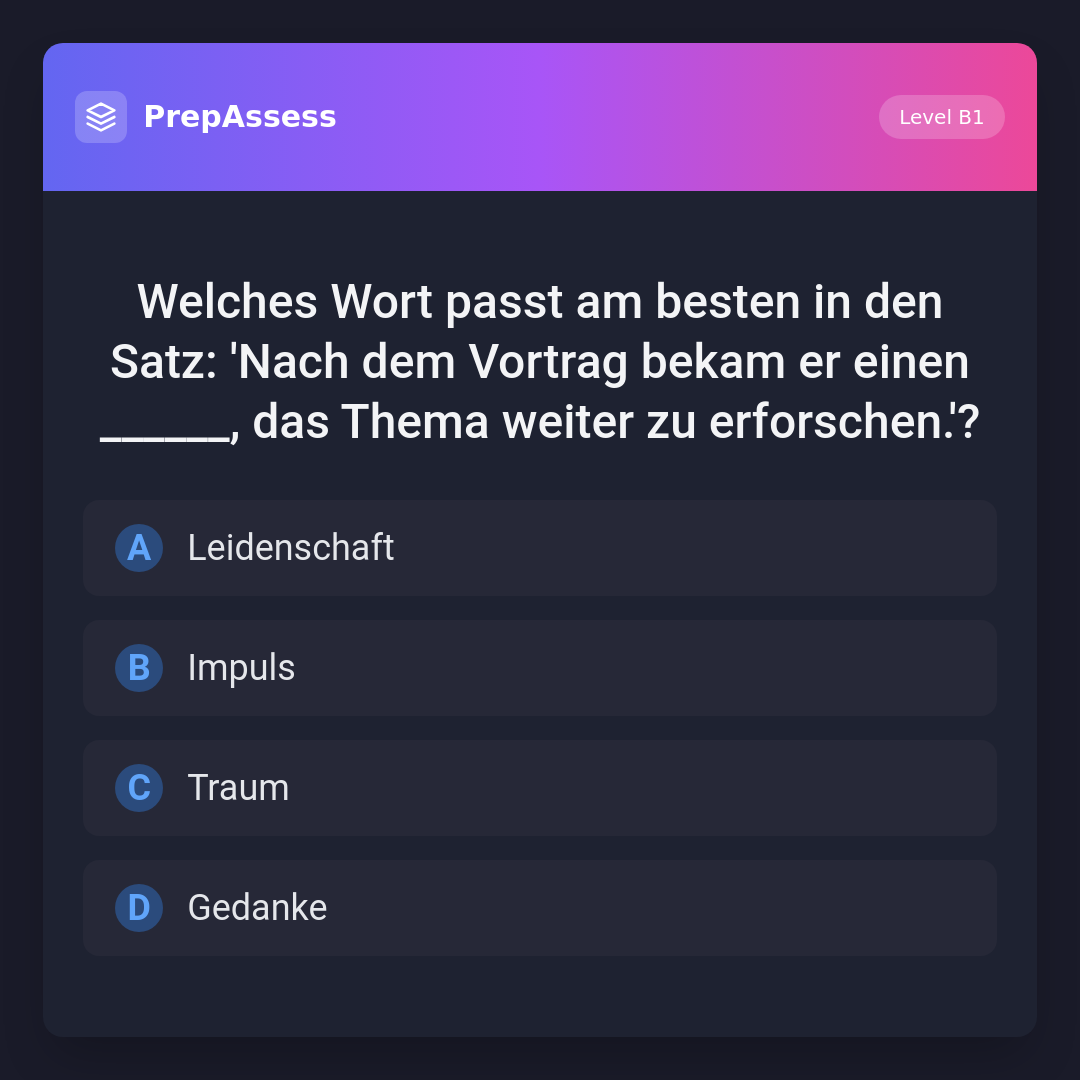 Welches Wort passt am besten in den Satz: 'Nach dem Vortrag bekam er einen ______, das Thema weiter zu erforschen.'?