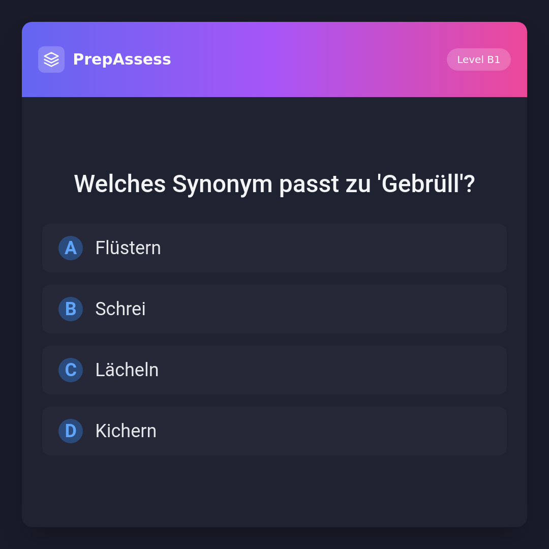 Das Wort 'Schrei' ist ein Synonym für 'Gebrüll', da beide ein lautes Geräusch beschreiben. Flüstern, Lächeln und Kichern sind leise oder stille Aktivitäten.