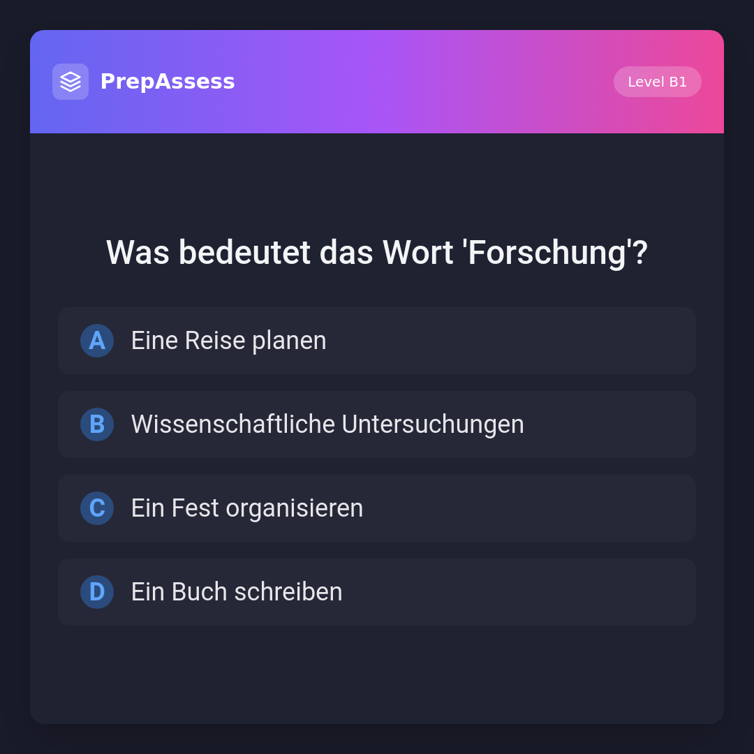 'Forschung' bedeutet 'wissenschaftliche Untersuchungen'. Die anderen Optionen beziehen sich auf unterschiedliche Aktivitäten, die nichts mit Forschung zu tun haben.