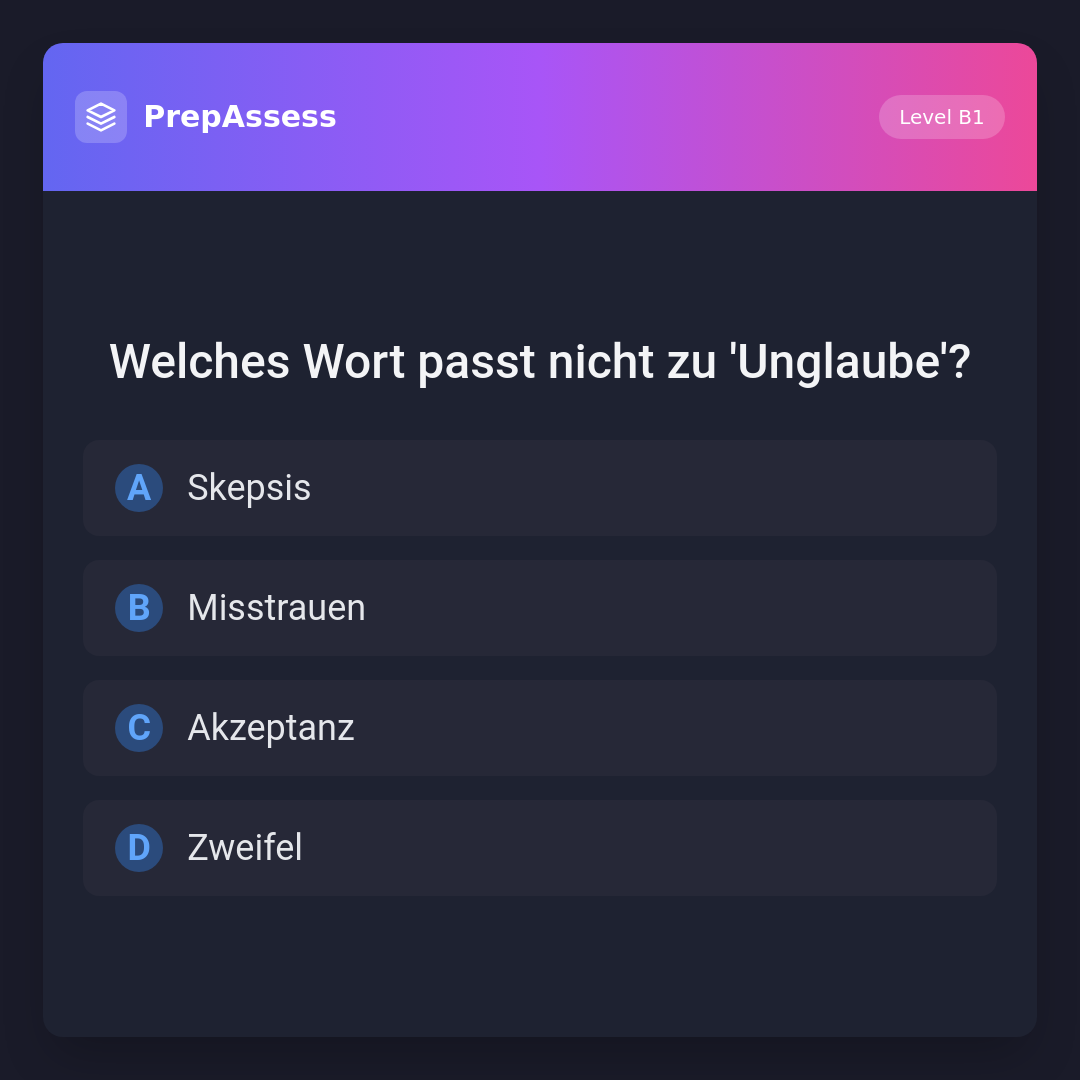 'Akzeptanz' passt nicht zu 'Unglaube', da es eine positive Annahme von etwas beschreibt. 'Skepsis', 'Misstrauen' und 'Zweifel' sind alle mit 'Unglaube' verbunden, da sie eine ähnliche Bedeutung von Nichtvertrauen oder Hinterfragen haben.
