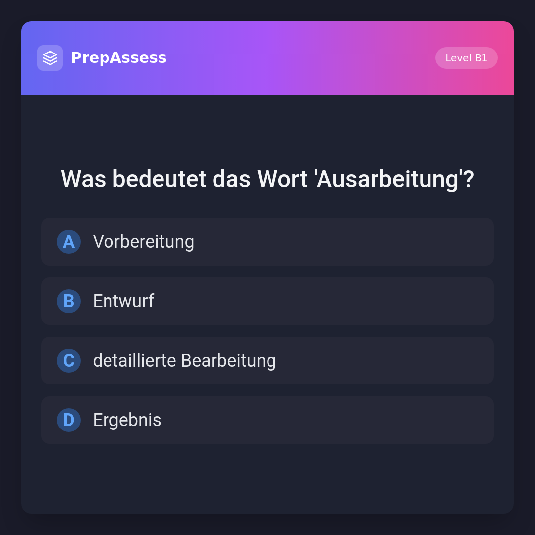 'Ausarbeitung' bedeutet eine detaillierte Bearbeitung oder Ausführung eines Plans oder Projekts. 'Vorbereitung' (a) bezieht sich auf den Prozess, bevor etwas beginnt. 'Entwurf' (b) ist eine Skizze oder ein erster Plan. 'Ergebnis' (d) ist das Endprodukt, nicht der Prozess der Bearbeitung.
