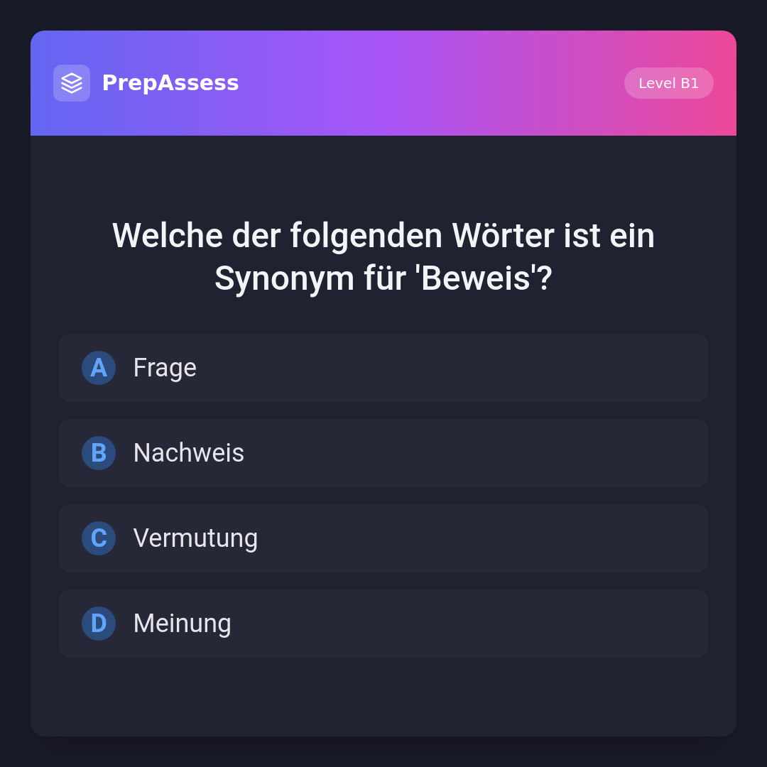 Welche der folgenden Wörter ist ein Synonym für 'Beweis'?