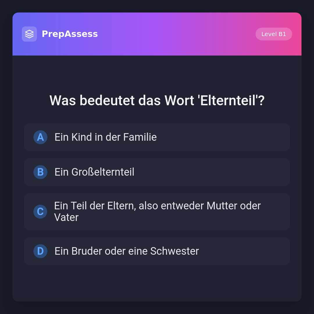 Der Begriff 'Elternteil' bezieht sich auf einen der beiden Eltern, also entweder die Mutter oder den Vater. Die anderen Optionen beziehen sich auf andere Familienmitglieder.