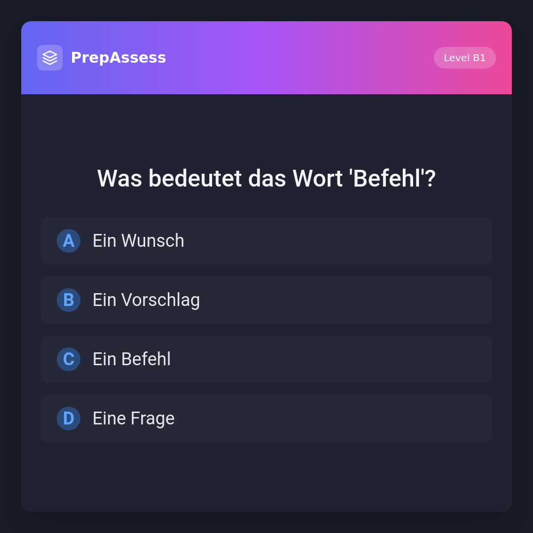 Das Wort 'Befehl' bedeutet 'eine Anweisung oder Anordnung', die oft von einer Autorität kommt. 'Ein Wunsch', 'Ein Vorschlag' und 'Eine Frage' sind keine passenden Bedeutungen für 'Befehl'.