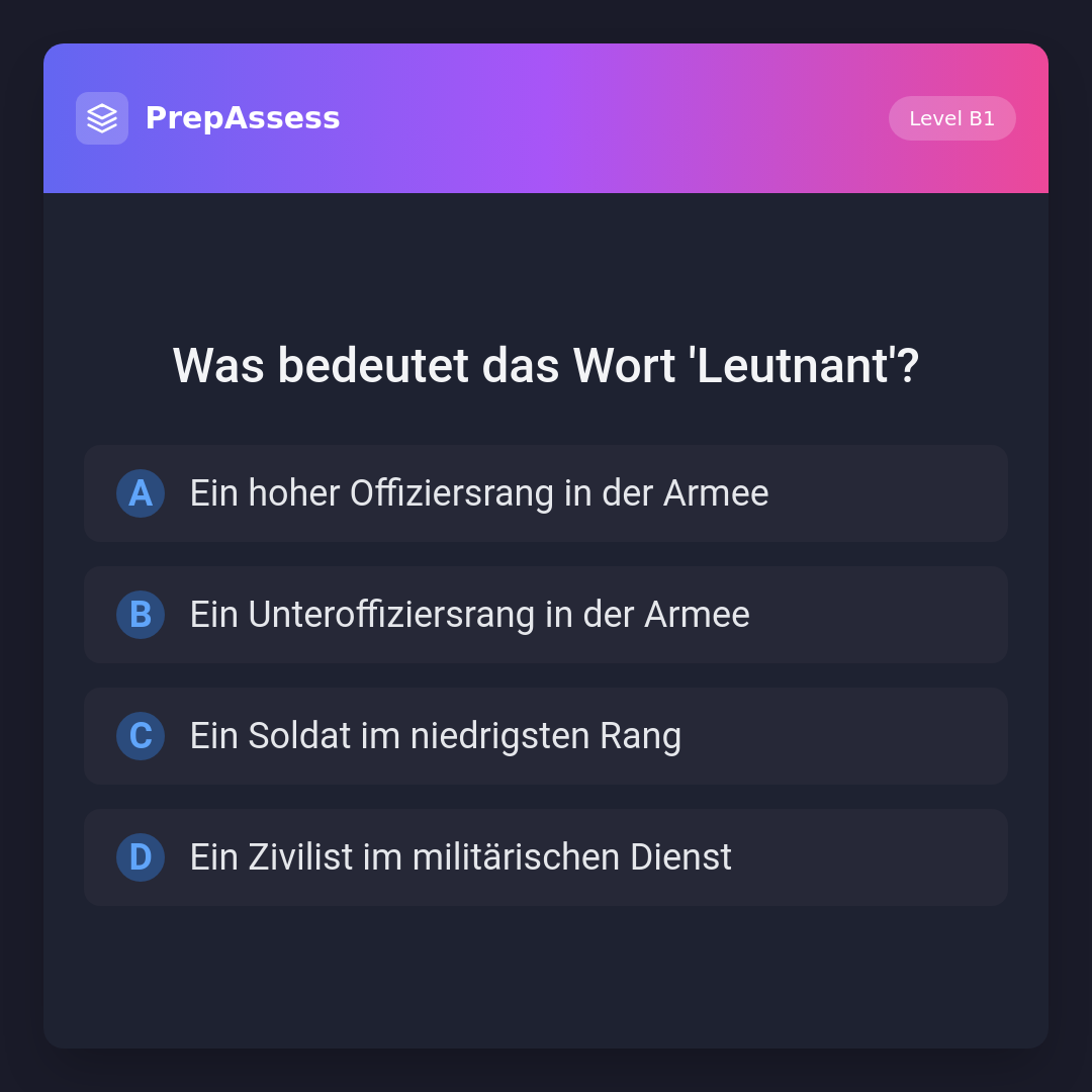 Der 'Leutnant' ist ein niedriger Offiziersrang in der Armee, nicht zu verwechseln mit einem hohen Offiziersrang oder einem Unteroffizier. Ein Soldat im niedrigsten Rang wäre ein 'Rekrut' und ein Zivilist im militärischen Dienst ist nicht korrekt.
