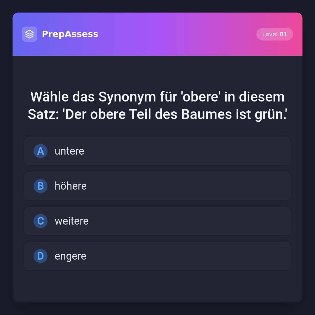 Wähle das Synonym für 'obere' in diesem Satz: 'Der obere Teil des Baumes ist grün.'