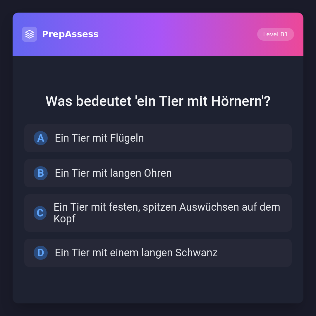 Ein Tier mit Hörnern hat feste, spitze Auswüchse auf dem Kopf. Die anderen Optionen beschreiben andere körperliche Merkmale.