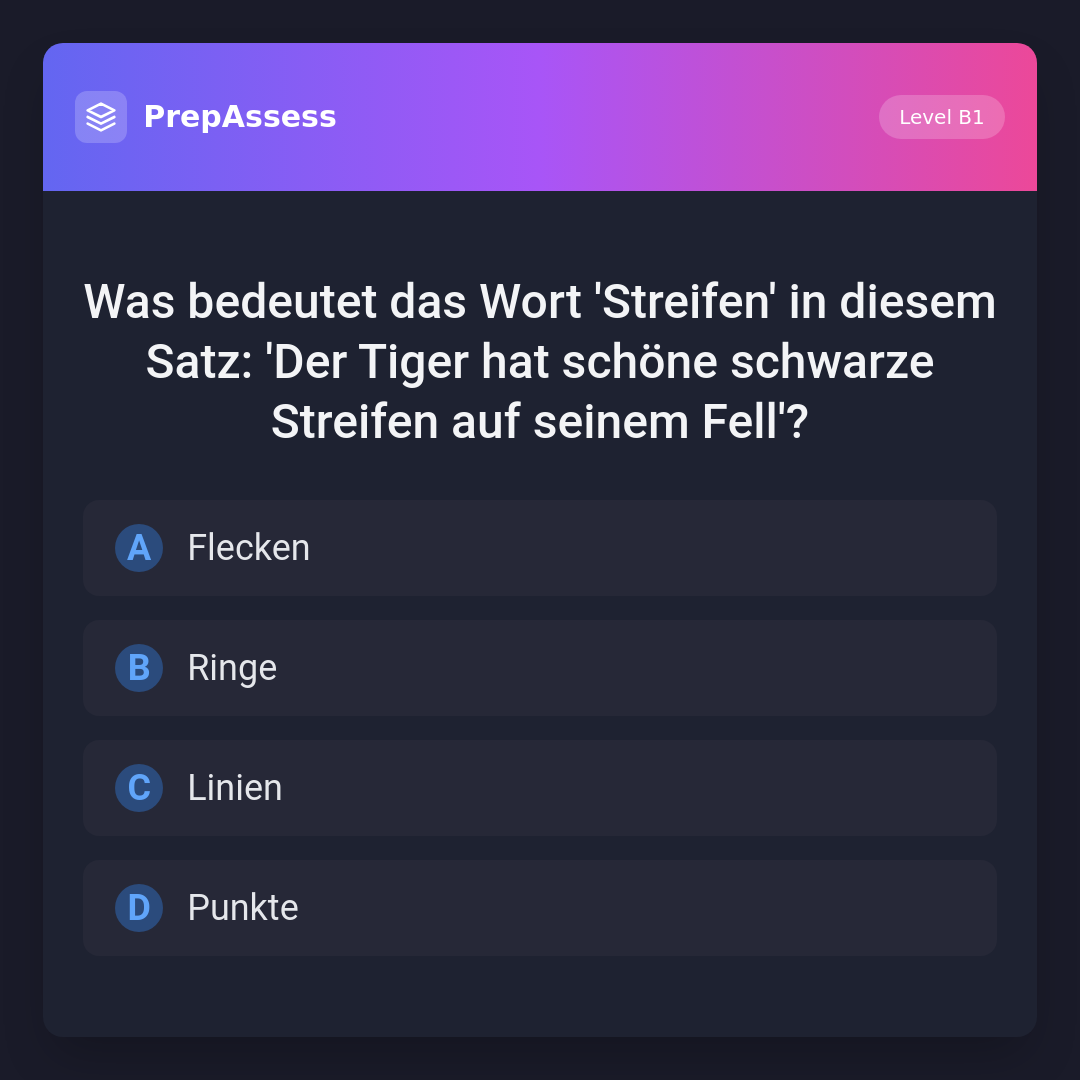 Was bedeutet das Wort 'Streifen' in diesem Satz: 'Der Tiger hat schöne schwarze Streifen auf seinem Fell'?