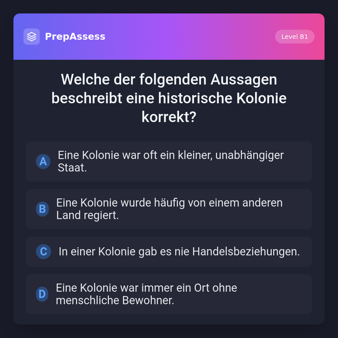 Welche der folgenden Aussagen beschreibt eine historische Kolonie korrekt?