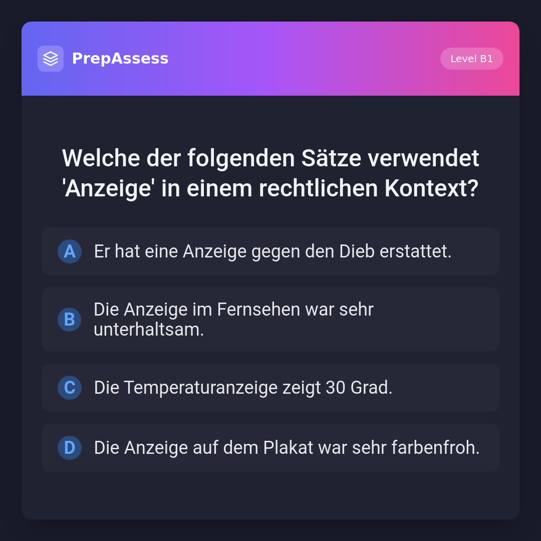 Welche der folgenden Sätze verwendet 'Anzeige' in einem rechtlichen Kontext?