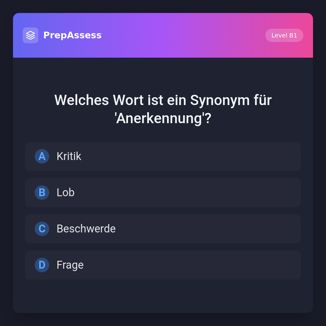 Welches Wort ist ein Synonym für 'Anerkennung'?