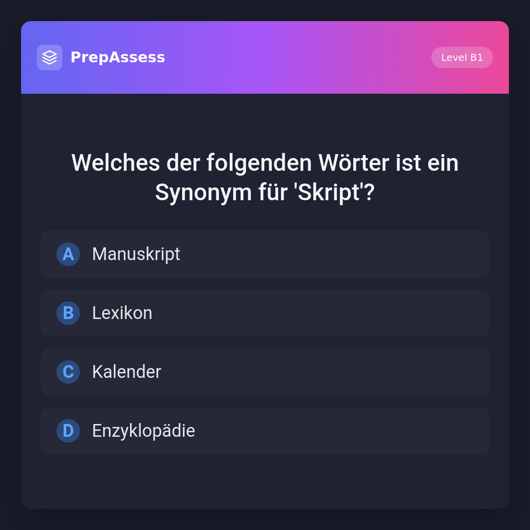 Welches der folgenden Wörter ist ein Synonym für 'Skript'?