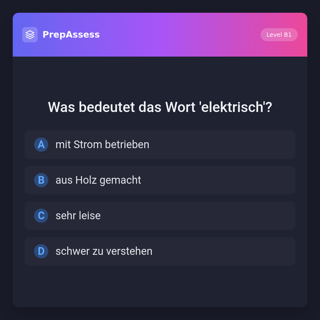 'Elektrisch' bezieht sich auf etwas, das mit Strom betrieben wird oder durch Elektrizität funktioniert. Die anderen Optionen sind nicht korrekt: 'aus Holz gemacht' würde 'hölzern' bedeuten, 'sehr leise' wäre 'leise' oder 'ruhig', und 'schwer zu verstehen' könnte 'kompliziert' oder 'schwierig' bedeuten.
