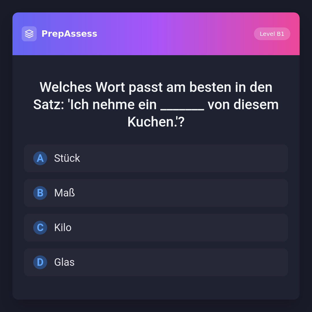 Welches Wort passt am besten in den Satz: 'Ich nehme ein _______ von diesem Kuchen.'?
