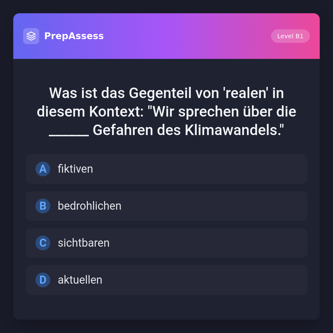 Was ist das Gegenteil von 'realen' in diesem Kontext: "Wir sprechen über die ______ Gefahren des Klimawandels."