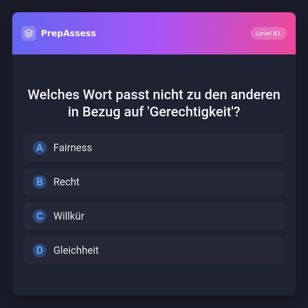Welches Wort passt nicht zu den anderen in Bezug auf 'Gerechtigkeit'?