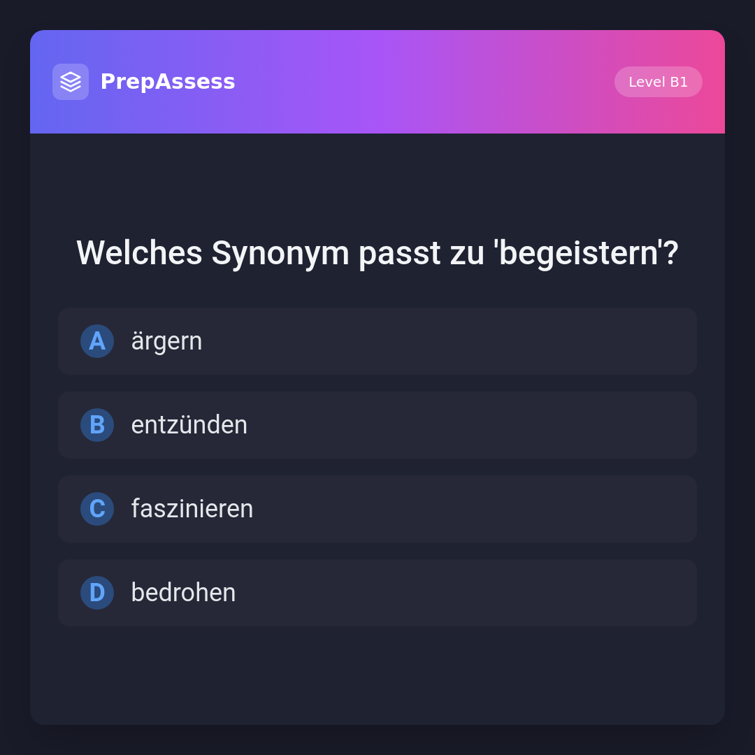 Das Wort 'faszinieren' ist ein passendes Synonym für 'begeistern', da es ebenfalls positive Faszination oder Interesse ausdrückt. Die anderen Optionen haben andere Bedeutungen.