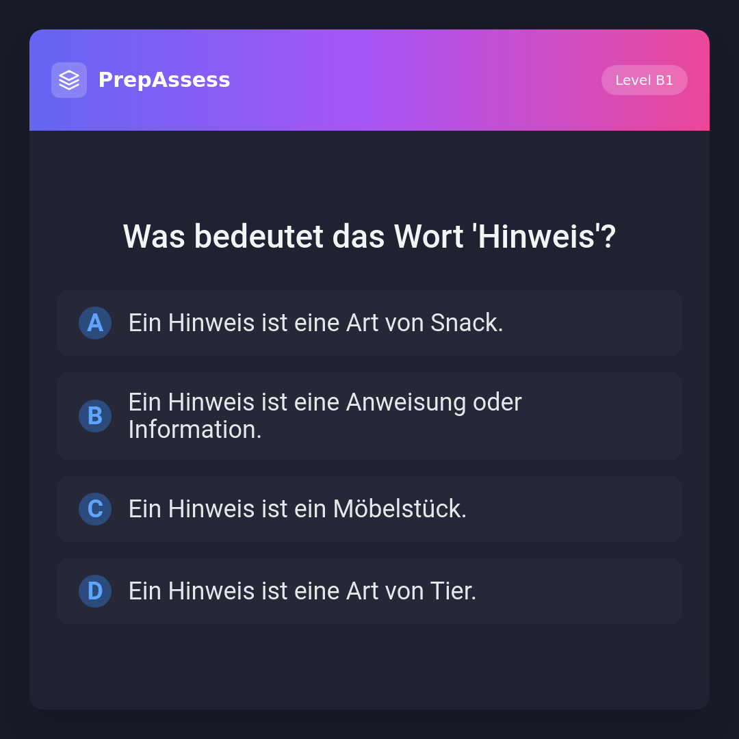 Das Wort 'Hinweis' bedeutet eine Anweisung oder Information, die auf etwas hinweist. Die anderen Optionen sind falsch, da sie keine logische Verbindung zur Bedeutung von 'Hinweis' haben.