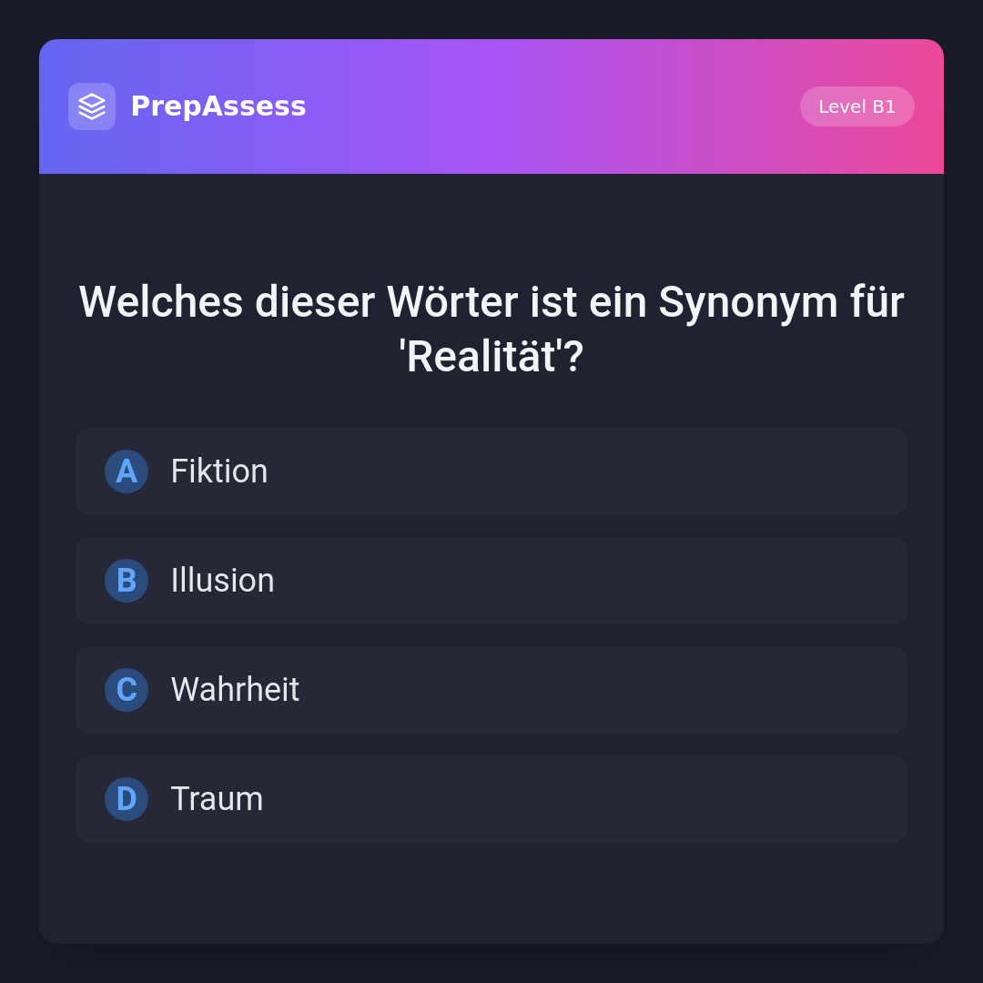Welches dieser Wörter ist ein Synonym für 'Realität'?