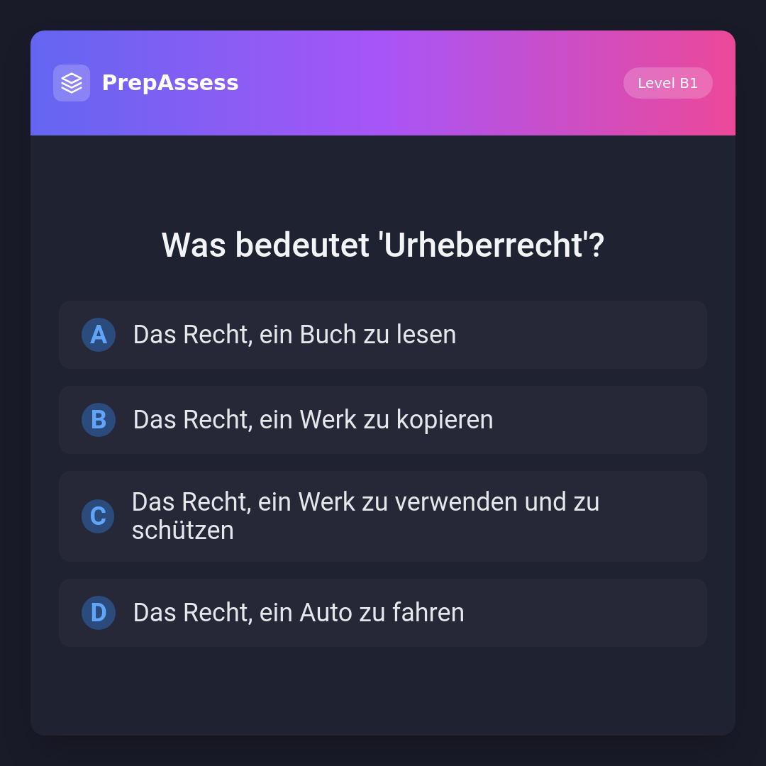 'Urheberrecht' bedeutet das Recht, ein Werk zu verwenden und zu schützen. Es schützt die kreative Arbeit eines Autors oder Künstlers. Die anderen Optionen beziehen sich nicht auf den Schutz oder die Nutzung kreativer Werke.