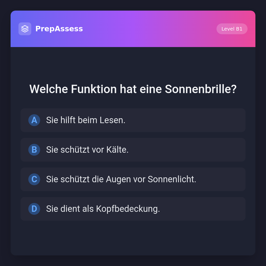 Eine Sonnenbrille schützt die Augen vor schädlichem Sonnenlicht. Die anderen Optionen beziehen sich auf Funktionen, die nicht mit einer Sonnenbrille in Verbindung stehen.