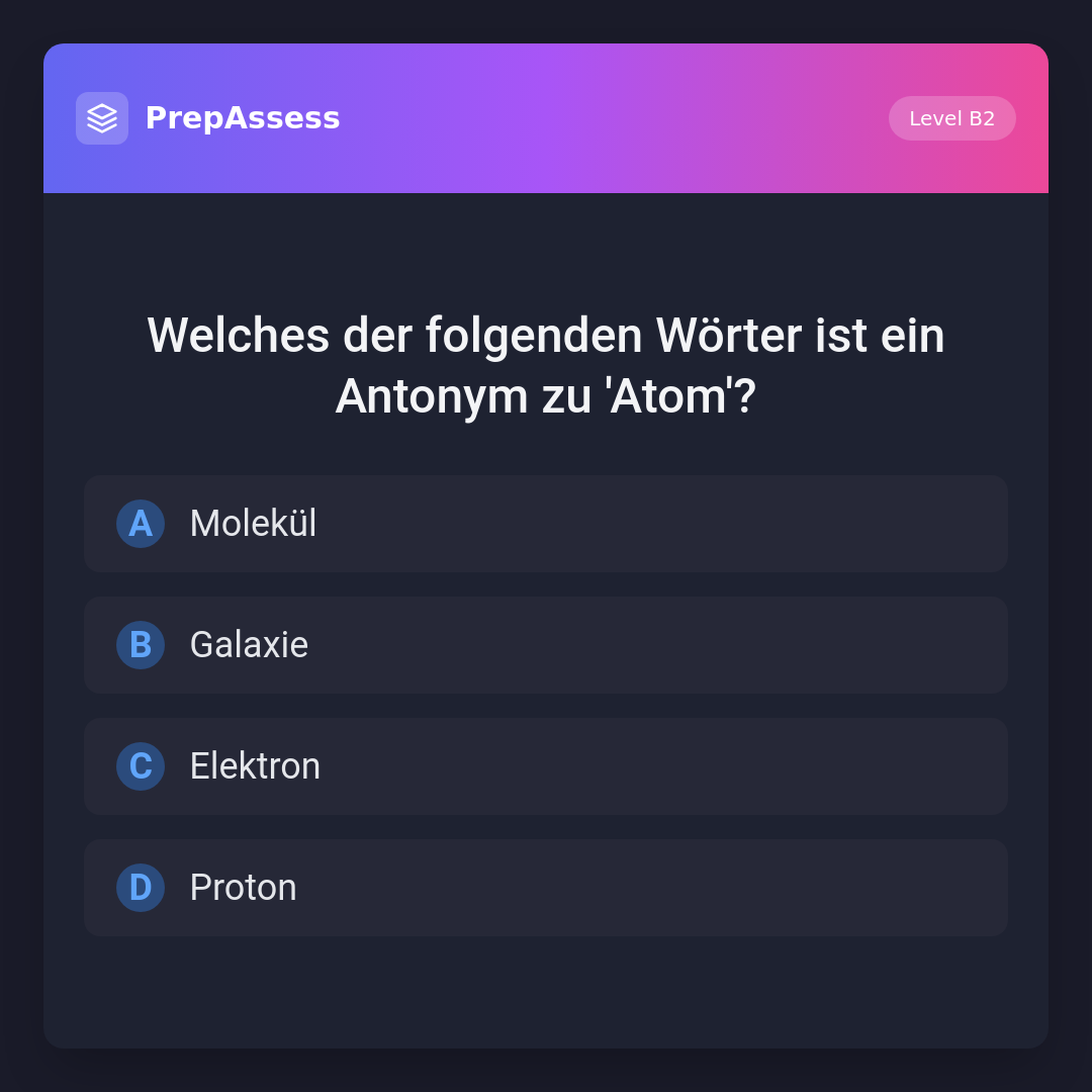 Welches der folgenden Wörter ist ein Antonym zu 'Atom'?