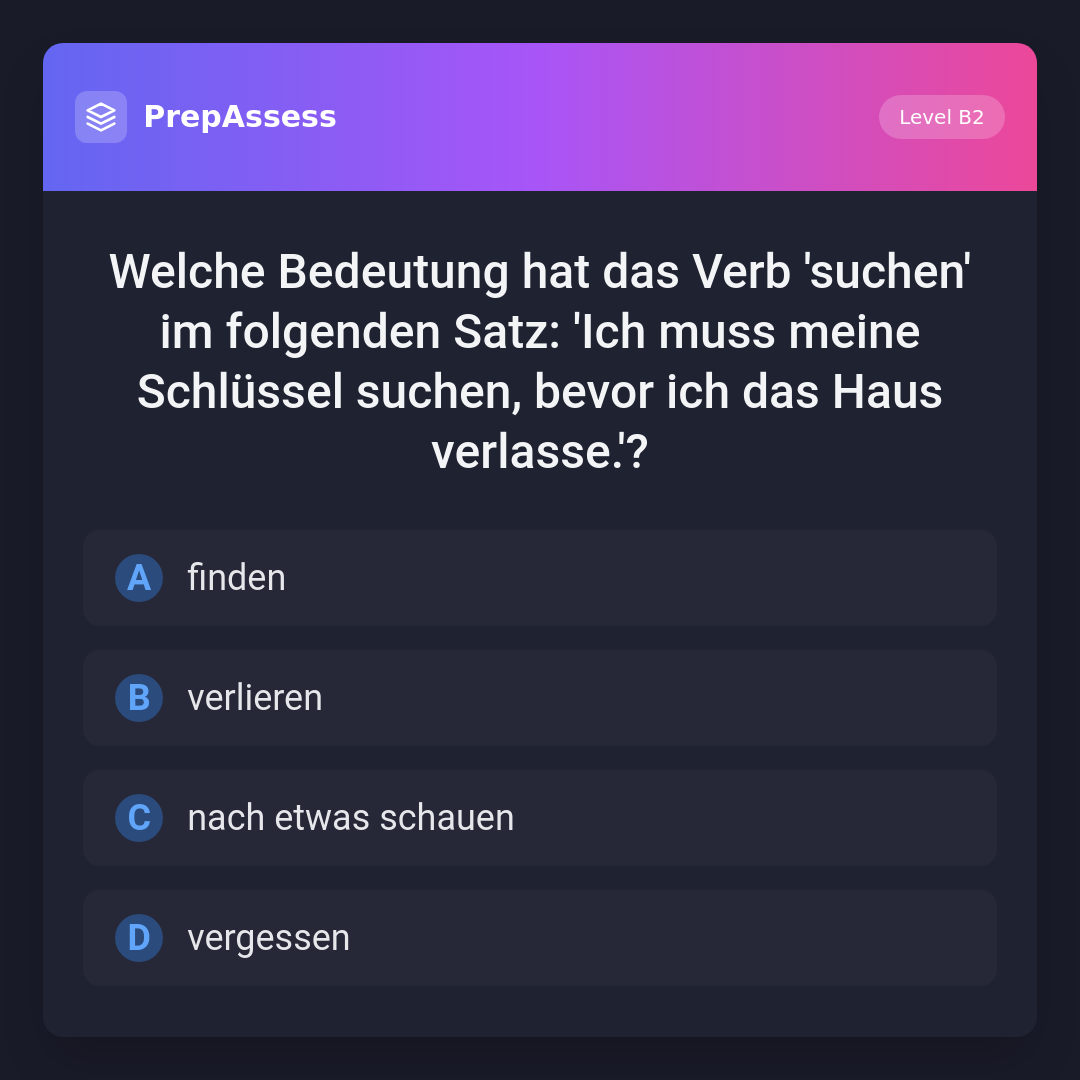 Welche Bedeutung hat das Verb 'suchen' im folgenden Satz: 'Ich muss meine Schlüssel suchen, bevor ich das Haus verlasse.'?