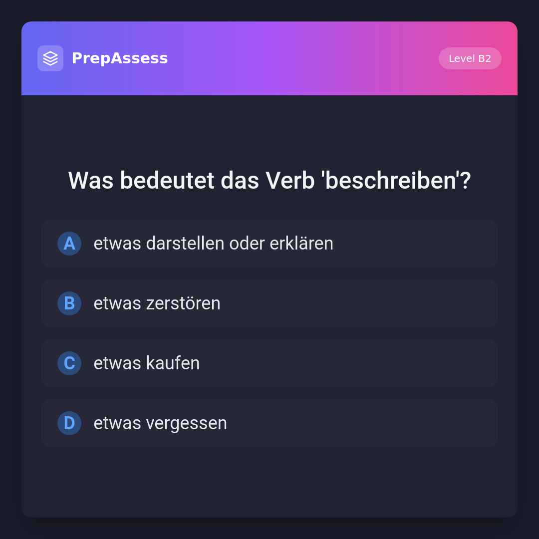 'Beschreiben' bedeutet, etwas darzustellen oder zu erklären. Die anderen Optionen (b: zerstören, c: kaufen, d: vergessen) haben andere Bedeutungen und sind daher falsch.