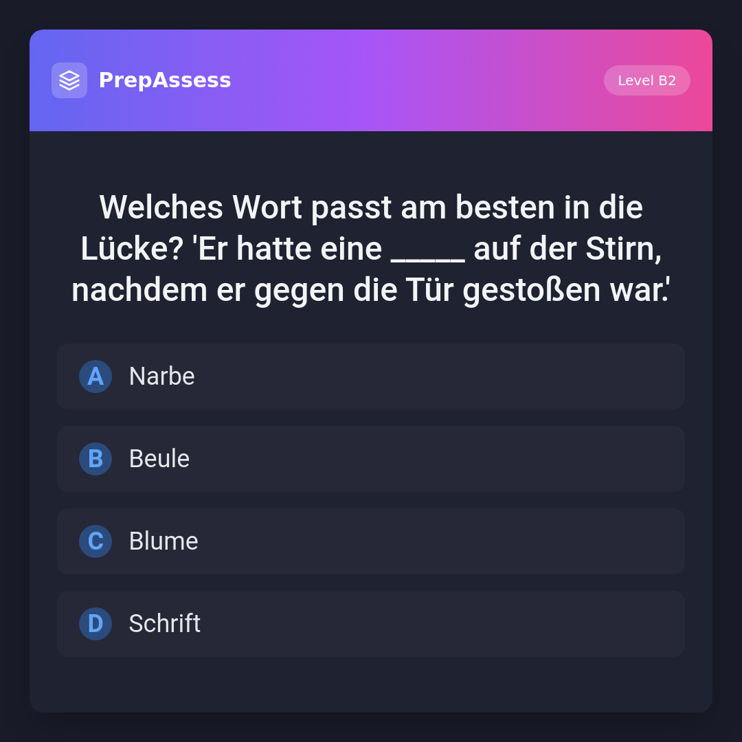 Welches Wort passt am besten in die Lücke? 'Er hatte eine _____ auf der Stirn, nachdem er gegen die Tür gestoßen war.'