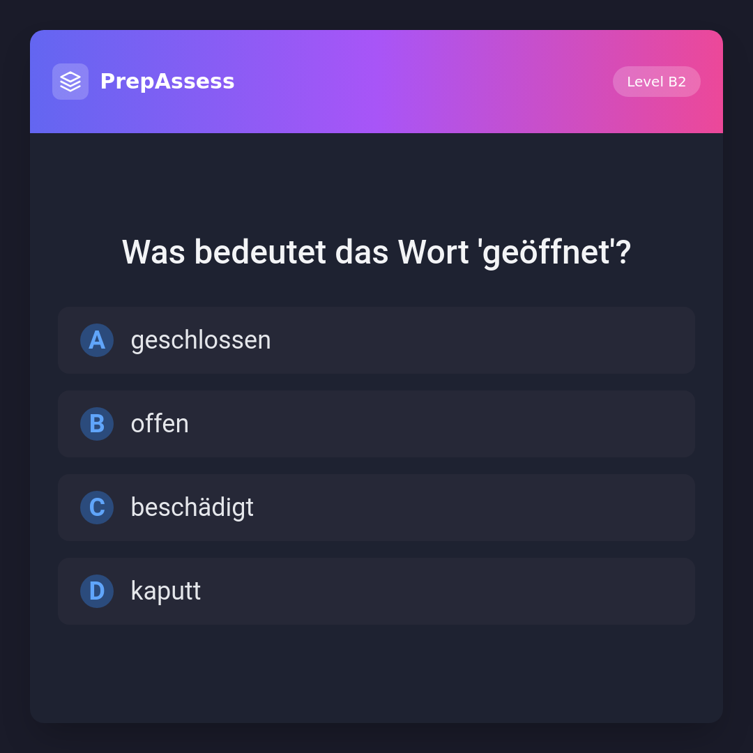 Das Wort 'geöffnet' bedeutet 'offen'. Es ist das Gegenteil von 'geschlossen'. Die anderen Optionen sind unpassend, da sie unterschiedliche Bedeutungen haben.
