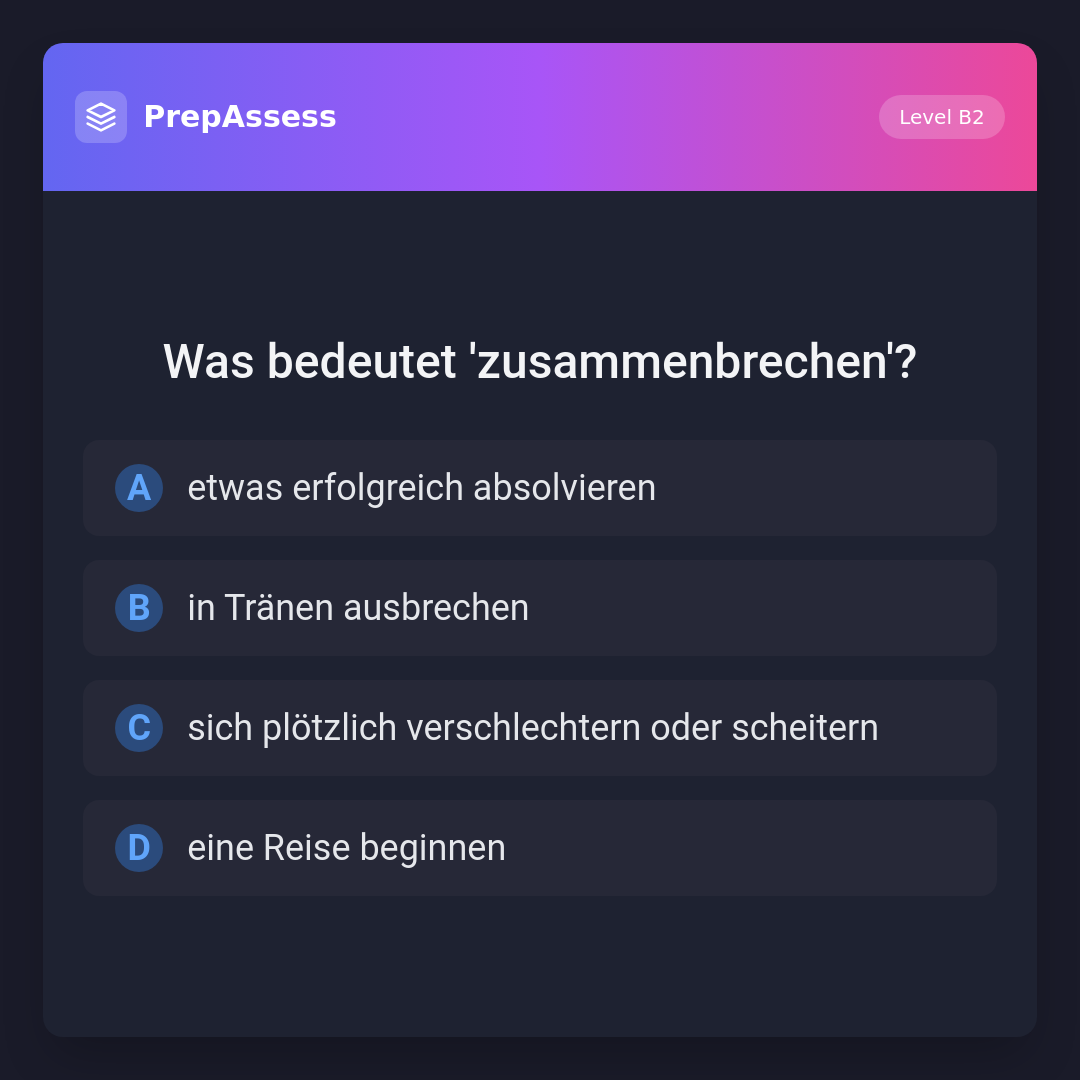 Das Wort 'zusammenbrechen' bedeutet, dass etwas plötzlich scheitert oder sich verschlechtert, wie bei einem Gebäude, das einstürzt, oder einer Person, die gesundheitlich oder emotional zusammenbricht. Die anderen Optionen beschreiben unterschiedliche Handlungen oder Zustände.