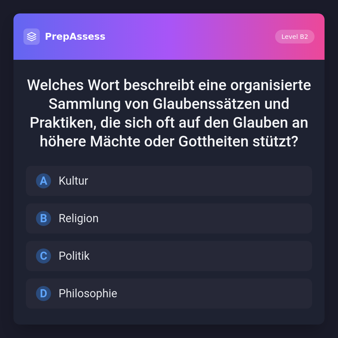 Welches Wort beschreibt eine organisierte Sammlung von Glaubenssätzen und Praktiken, die sich oft auf den Glauben an höhere Mächte oder Gottheiten stützt?