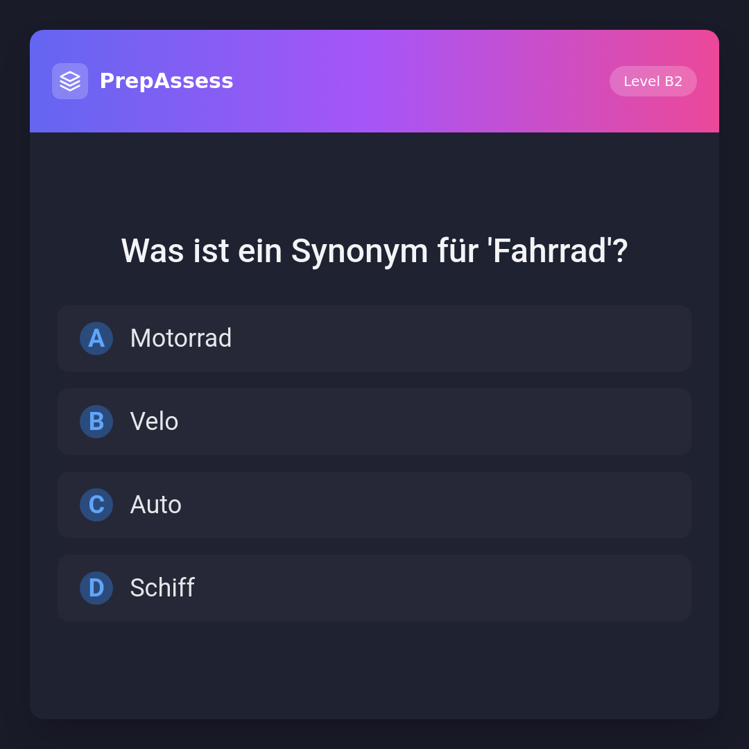 Antwort b ist korrekt, da 'Velo' ein Synonym für 'Fahrrad' ist, besonders in der Schweiz. Die anderen Optionen sind verschiedene Arten von Fahrzeugen, die mit einem Fahrrad nicht gleichzusetzen sind.