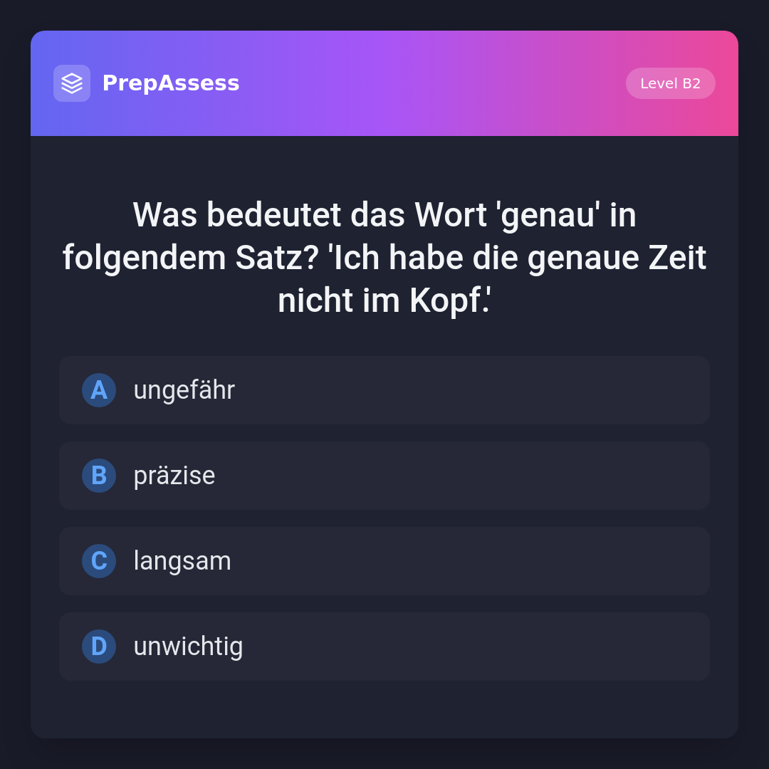 Was bedeutet das Wort 'genau' in folgendem Satz? 'Ich habe die genaue Zeit nicht im Kopf.'
