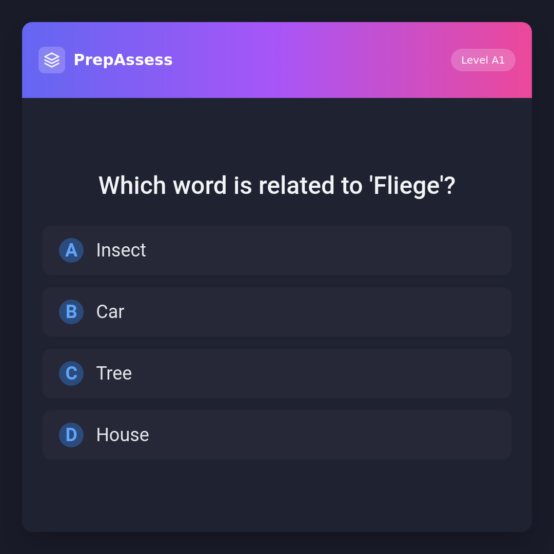 'Fliege' is related to 'insect' as it is a type of insect. It is not related to 'car', 'tree', or 'house'.