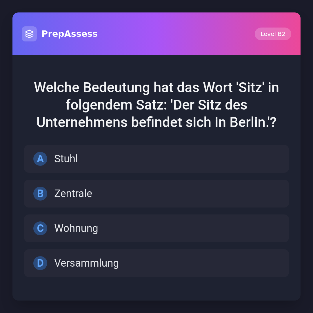 Welche Bedeutung hat das Wort 'Sitz' in folgendem Satz: 'Der Sitz des Unternehmens befindet sich in Berlin.'?