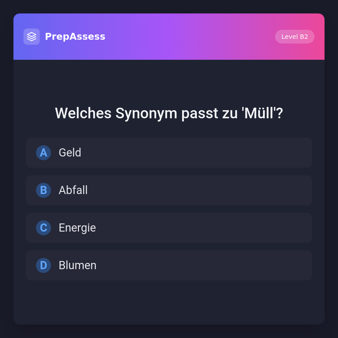 'Abfall' ist ein Synonym für 'Müll'. Beide Begriffe beziehen sich auf unerwünschte oder verbrauchte Materialien. Die anderen Optionen sind nicht synonyme Begriffe.