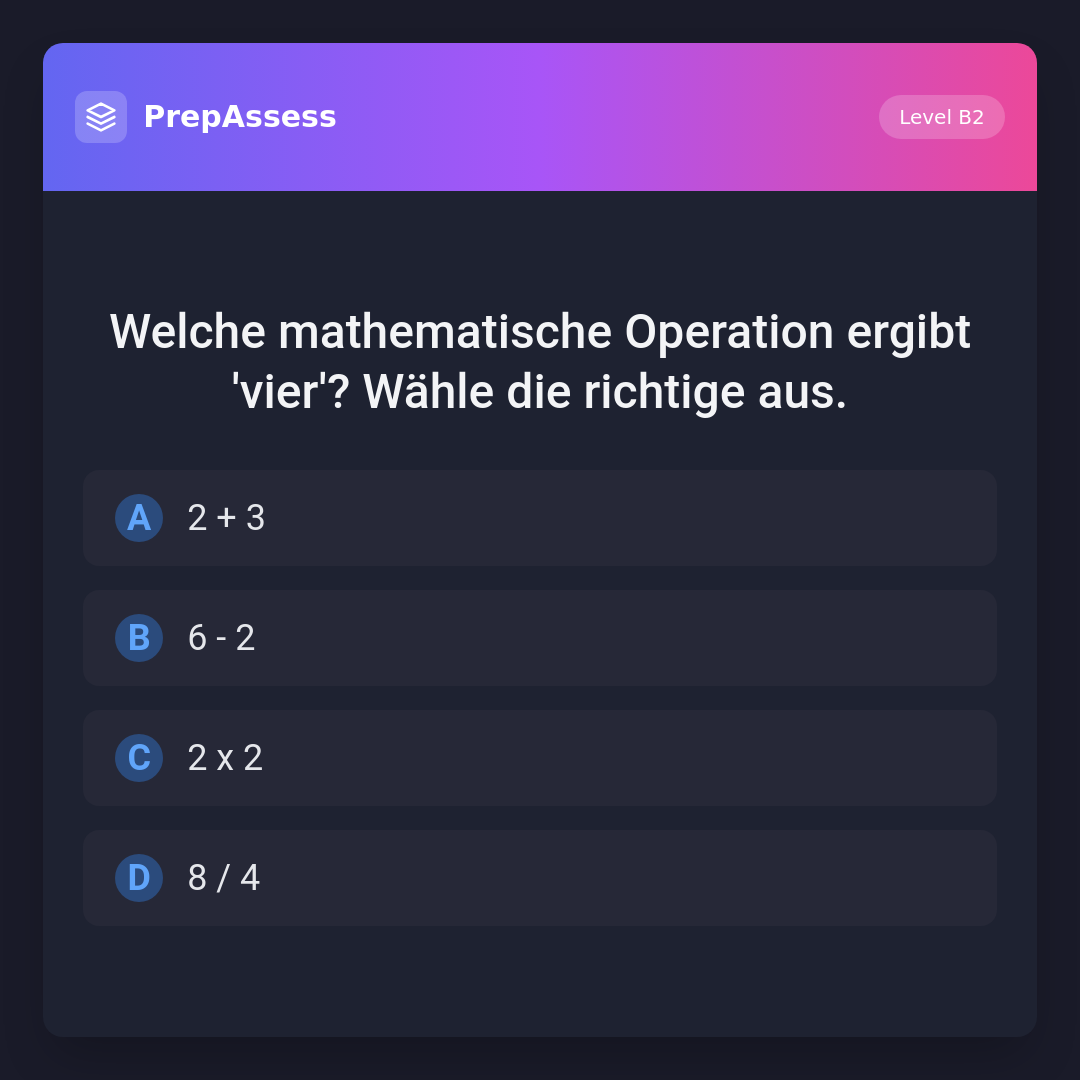 Welche mathematische Operation ergibt 'vier'? Wähle die richtige aus.