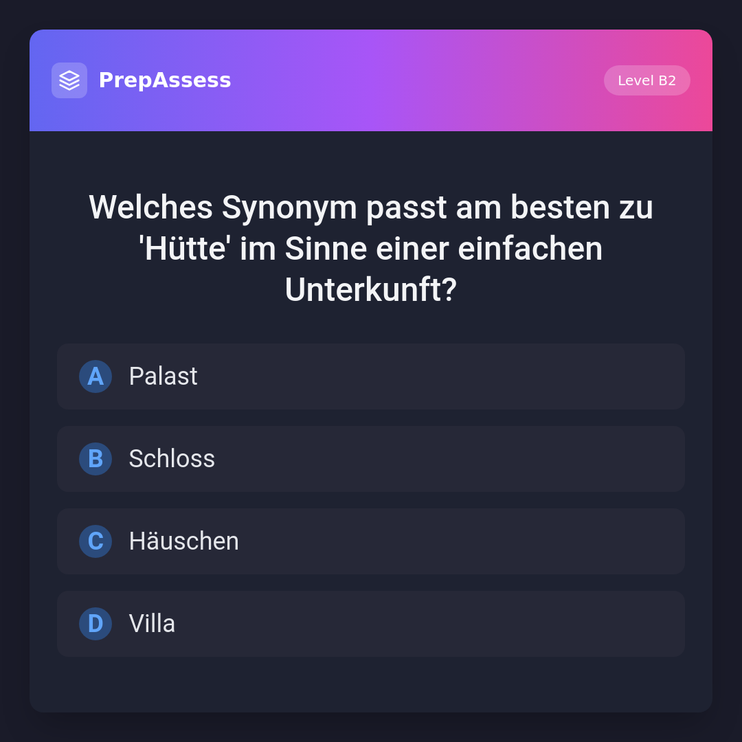Welches Synonym passt am besten zu 'Hütte' im Sinne einer einfachen Unterkunft?