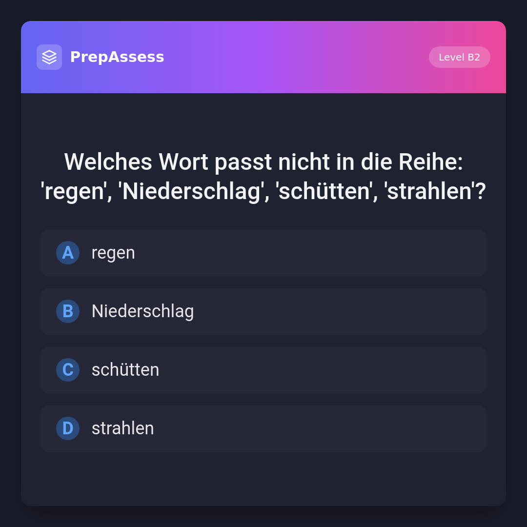 Welches Wort passt nicht in die Reihe: 'regen', 'Niederschlag', 'schütten', 'strahlen'?