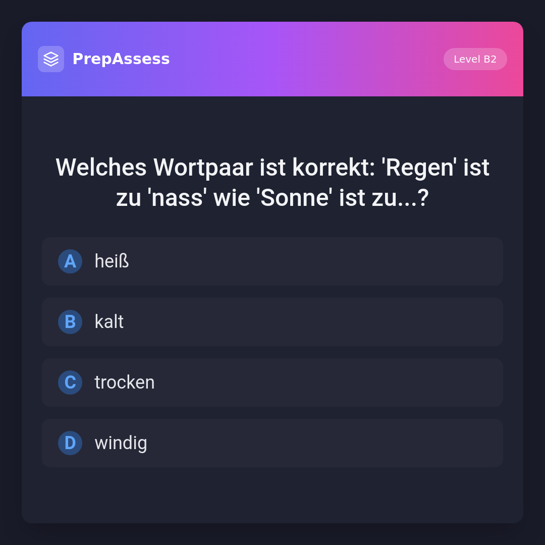 Welches Wortpaar ist korrekt: 'Regen' ist zu 'nass' wie 'Sonne' ist zu...?