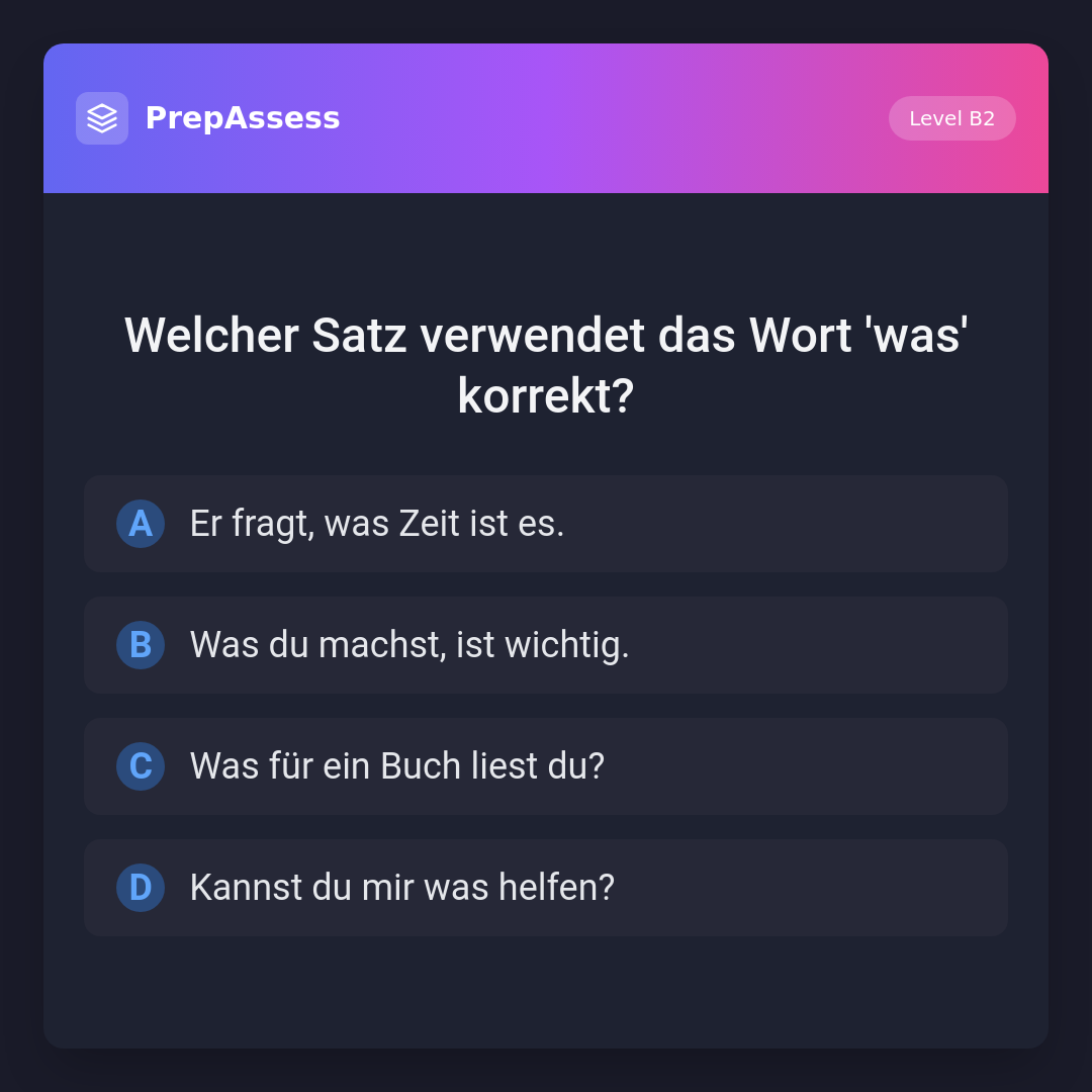 Welcher Satz verwendet das Wort 'was' korrekt?