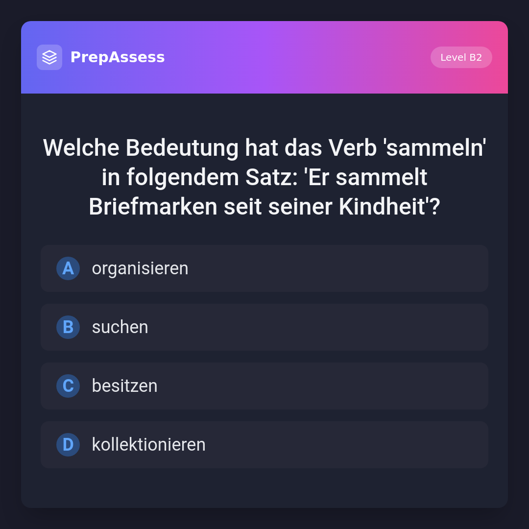 Welche Bedeutung hat das Verb 'sammeln' in folgendem Satz: 'Er sammelt Briefmarken seit seiner Kindheit'?