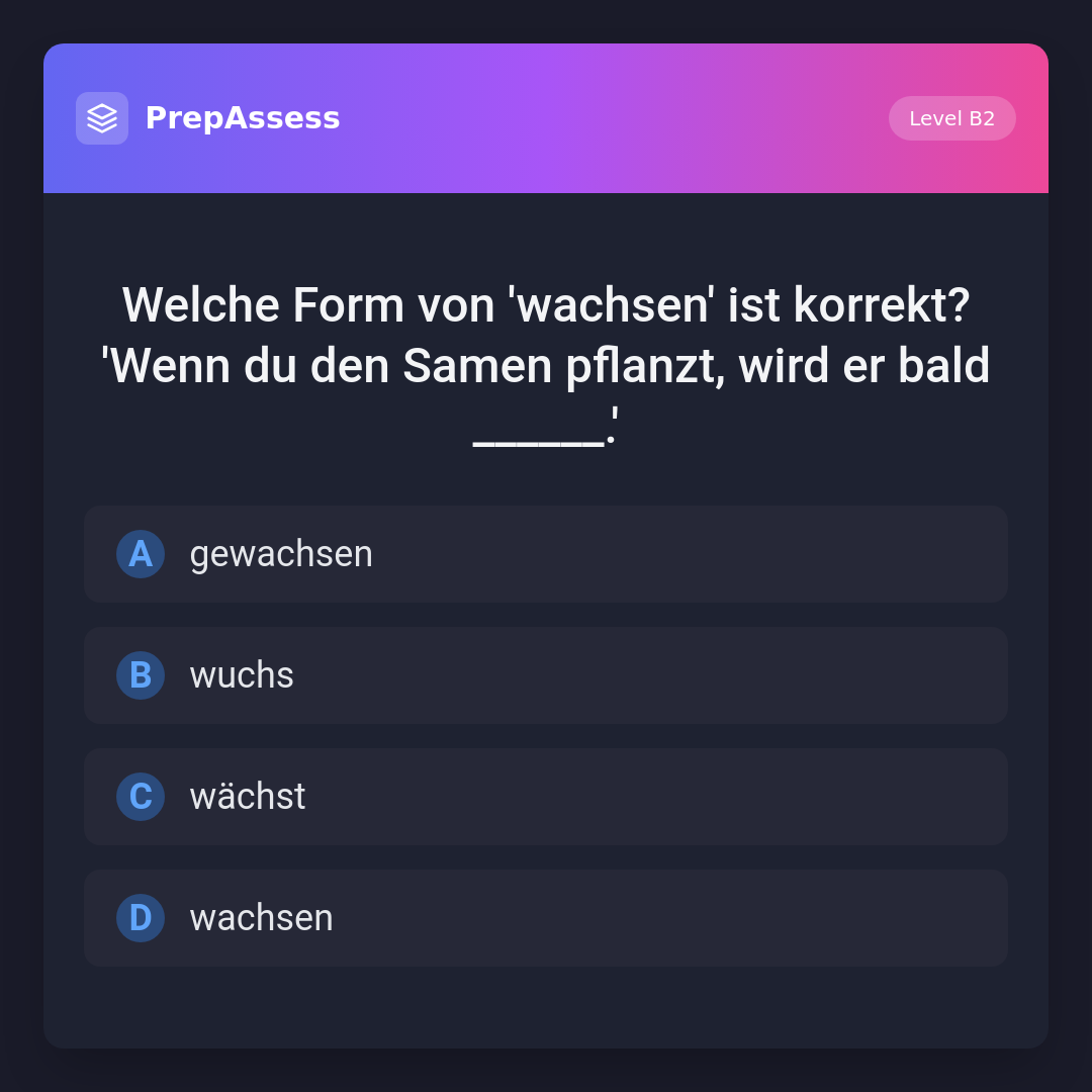 Welche Form von 'wachsen' ist korrekt? 'Wenn du den Samen pflanzt, wird er bald ______.'
