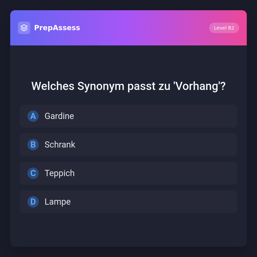 Das Synonym für 'Vorhang' ist 'Gardine', da beide Begriffe für Stoffbahnen verwendet werden, die vor Fenstern hängen. 'Schrank', 'Teppich' und 'Lampe' sind Einrichtungsgegenstände, die nicht als Synonym für 'Vorhang' verwendet werden.