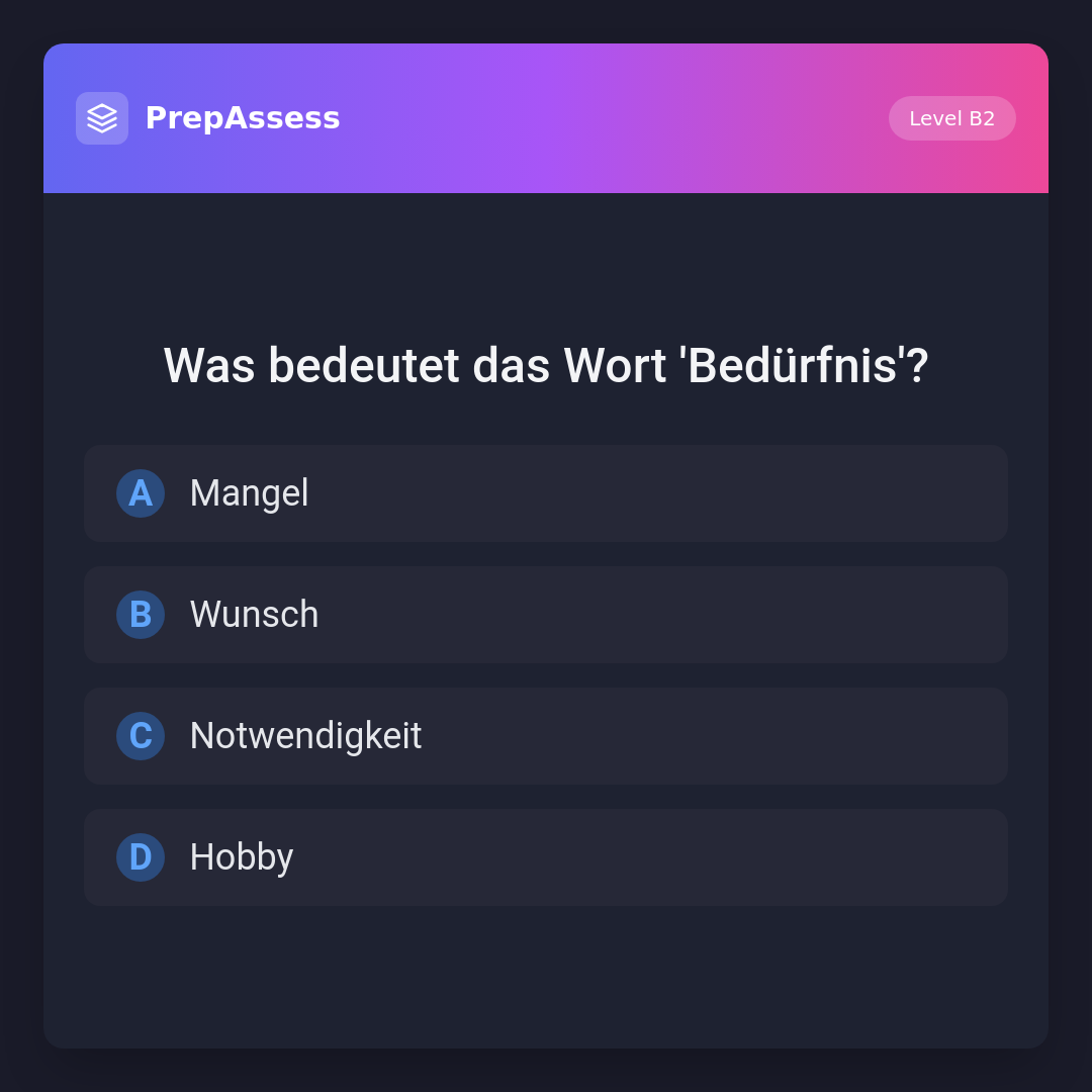'Bedürfnis' beschreibt einen Wunsch oder ein Verlangen nach etwas, das als notwendig empfunden wird. 'Mangel' bedeutet das Fehlen von etwas, 'Notwendigkeit' ist etwas, das unbedingt erforderlich ist, und 'Hobby' ist eine Freizeitbeschäftigung.